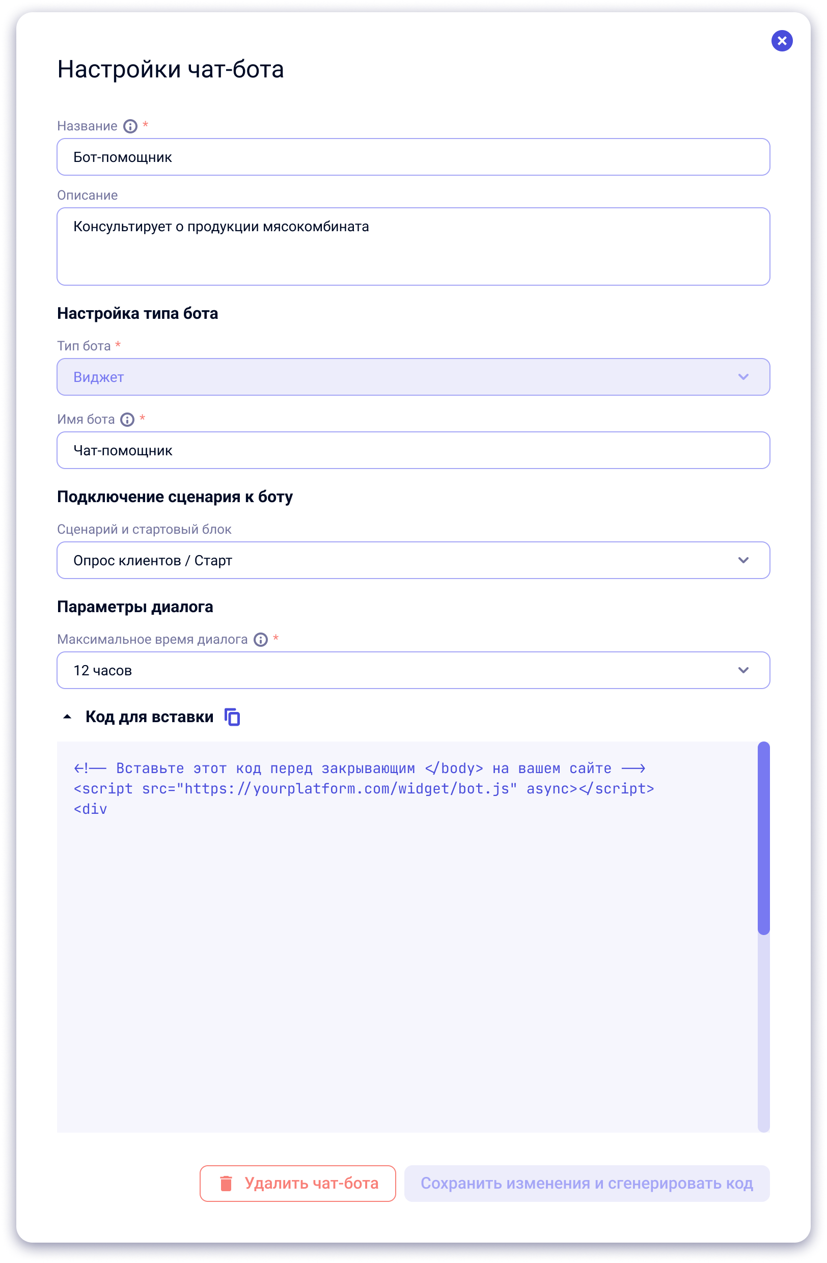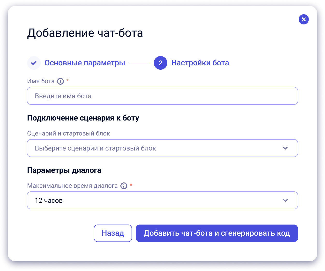 После заполнения нажмите «Добавить чат-бота и сгенерировать код».